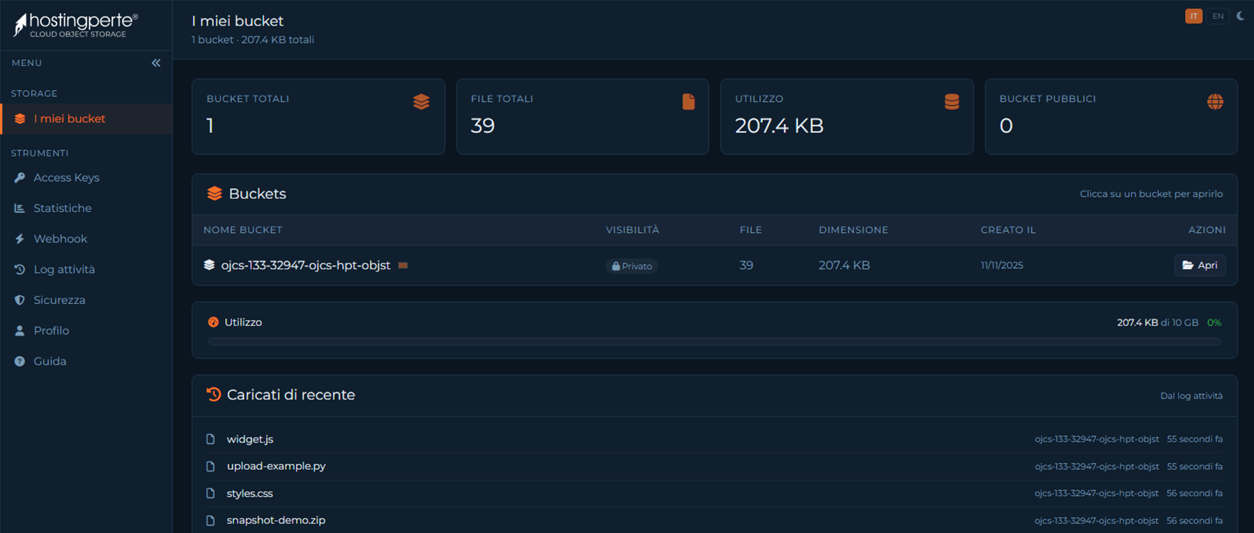 Archivia, gestisci e distribuisci i tuoi dati su un’infrastruttura completamente italiana, con prestazioni elevate, compatibilità totale con S3 e nessun costo aggiuntivo per traffico o API. La soluzione ideale per backup, applicazioni moderne e grandi volumi di file.